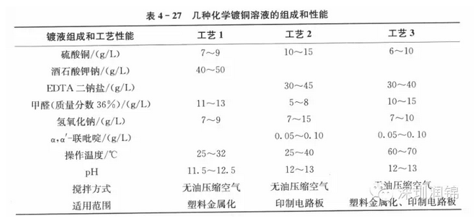 值得肯定的是,經(jīng)過不斷的努力,人們發(fā)明了一些高速穩(wěn)定的化學(xué)鍍銅新工藝,溶液 可以連續(xù)使用幾個月以上,并逐步實現(xiàn)了對鍍液的自動控制和調(diào)整。幾種較穩(wěn)定的化學(xué)鍍銅溶液的組成和性能比較見表4-27,其中的酒石酸鉀鈉、EDTA二鈉鹽為配位劑,它使銅離子在堿性條件下的溶液中不形成Cu(OH)2沉淀; α ,α'-聯(lián)吡啶等是溶液的穩(wěn)定劑,只需極少量即可有效地抑制氧化銅的生成和氧化亞銅的進(jìn)一步還原。